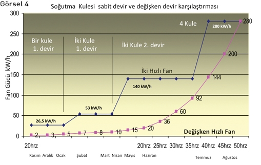 Kulenin enerji tüketiminde klasik bir kule ile değişken devirli kule arasındaki verim farkı aşağıdaki tabloda gözükmektedir. 2010 yılında Soğutma kulelerinin yeni otomasyon sistemine uygulamasında, kule su seviyeleri, fanlar, frekans ve kWh tüketim değerleri, yağmurlama pompaları, damperler, iletgenlik değerleri ile blöf vana pozisyonu, hepsi otomatik veya manuel ekrandan tek tek kontrol edilir hale getirilerek, otomasyon merkezi üzerinden tam kumanda sağlanmıştır.(Bkz. Görsel 4)