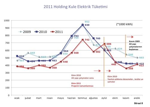 Devreye alınan Otomasyon sistemi kontrolunda ve yeni sistem mantığı ile 2010 ve 2011 yılı Holding Kule elektrik tüketimi karşılaştırılmasında Eylül ayları karşılaştırması 1.511.000 kWh/yıl, 2010 yılının, proje etkisinden arındırılmış hali ile yapılan karşılaştırma 1.339.000 kWh/yıl, 2010 yılı içindeki proje etkisi ile birlikte, faturalar üzerinden 01Ocak- 31 Aralık tüketim karşılaştırması ile 1.099.000 kWh/yıl tutmaktadır.