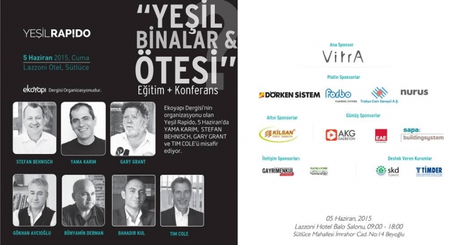 Mimarlık ve yapı sektörünün profesyonelleri tüm dünyada Çevre Günü olarak kutlanan 5 Haziran 2015 tarihinde, sürdürülebilir mimari ve kentsel tasarımı konuşmak üzere “Yeşil Binalar ve Ötesi Konferansı”nda bir araya geliyor. Ekoyapı Dergisi tarafından VitrA ana sponsorluğunda düzenlenen ve ‘yeşil binalar konusunda farkındalığı artırmak’ hedefiyle yola çıkan etkinlik, İstanbul Lazzoni Hotel’de gerçekleşecek. Dörken Sistem, Trakya Cam, Forbo Flooring ve Nurus’un “Platin Sponsor” olarak yer alacağı etkinliğe, Kilsan “Altın Sponsor” olarak, AKG Gazbeton, Sapa Group ve EAE Aydınlatma firmaları ise “Gümüş Sponsor” olarak destek veriyor.