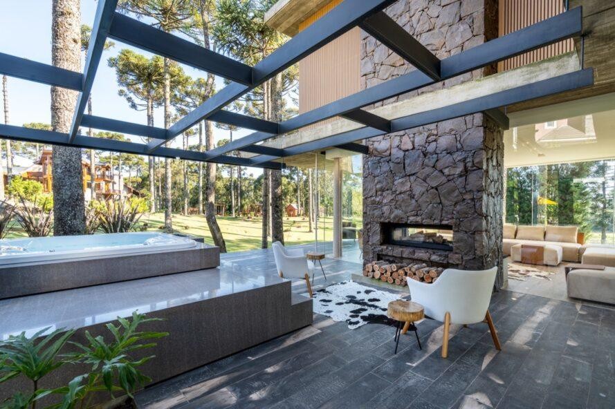 Doğal taş ve ahşap malzeme paleti, iç ve dış mekân arasındaki sınırları şeffaflaştırırken, sessiz bir renk şeması, yemyeşil dış ortama odaklanmaya devam ediyor. Binanın enerji ayak izini azaltmaya yardımcı olan güneş panelleri, yağmur suyu toplama sistemi ve geniş cam alanlarına ek olarak, çift yanmalı şöminelerde düşünülmüş. Bu şöminelerde, bitkisel bazlı yakıt kullanımını % 50'nin üzerinde azaltmak için etanol ve sertifikalı yakacak odun kullanılıyor. Ayrıca araziye yerel ağaçlar dikilerek binanın karbon ayak izini dengelenmeye çalışılmış.