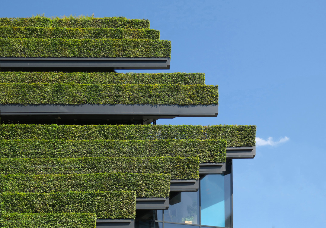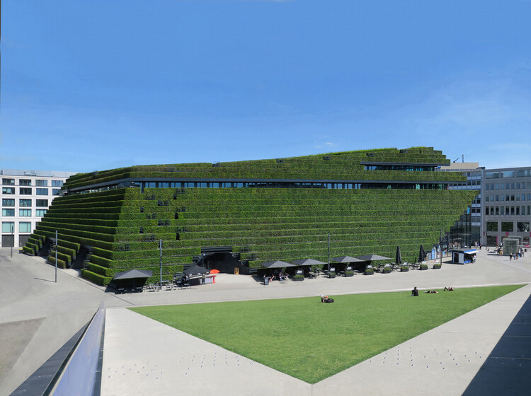 Yapının mimari formu, geleneksel blok tipolojisinden uzaklaşıyor ve eğimli yüzeyleriyle dikkat çekiyor. Park ve meydana bakan bu yüzeyler tamamen karaağaç çitleriyle kaplanmış. Düz olarak ölçüldüğünde 8 kilometreyi aşan bu bitkisel cephe, yalnızca estetik bir katkı sağlamakla kalmıyor, aynı zamanda: