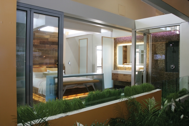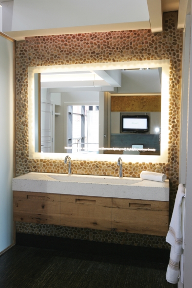 • Özel banyo duvarları, taş ocaklarından çıkartılmış taşların çevre dostu bir alternatifi olan çevreye makineyle zarar vermeden elle toplanmış Miami plajının çakılları ile tasarlanmış.