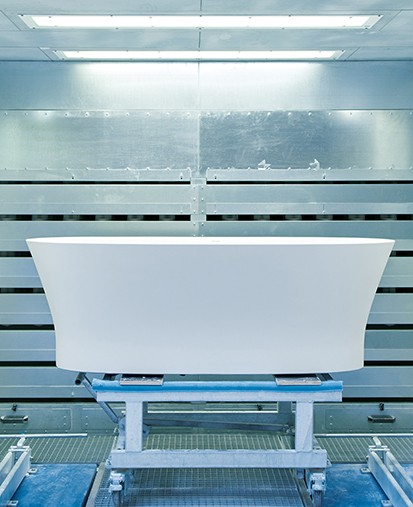 Duravit üretiminde çalışanları Cape Cod banyolarının ikonik ve özel hatlarına ulaşması için elde özel bir taşlama yaparlar. Ürünler, özel tasarlanıp, tek tek elden geçerek sahnede yerlerini almaya hazırlanır.