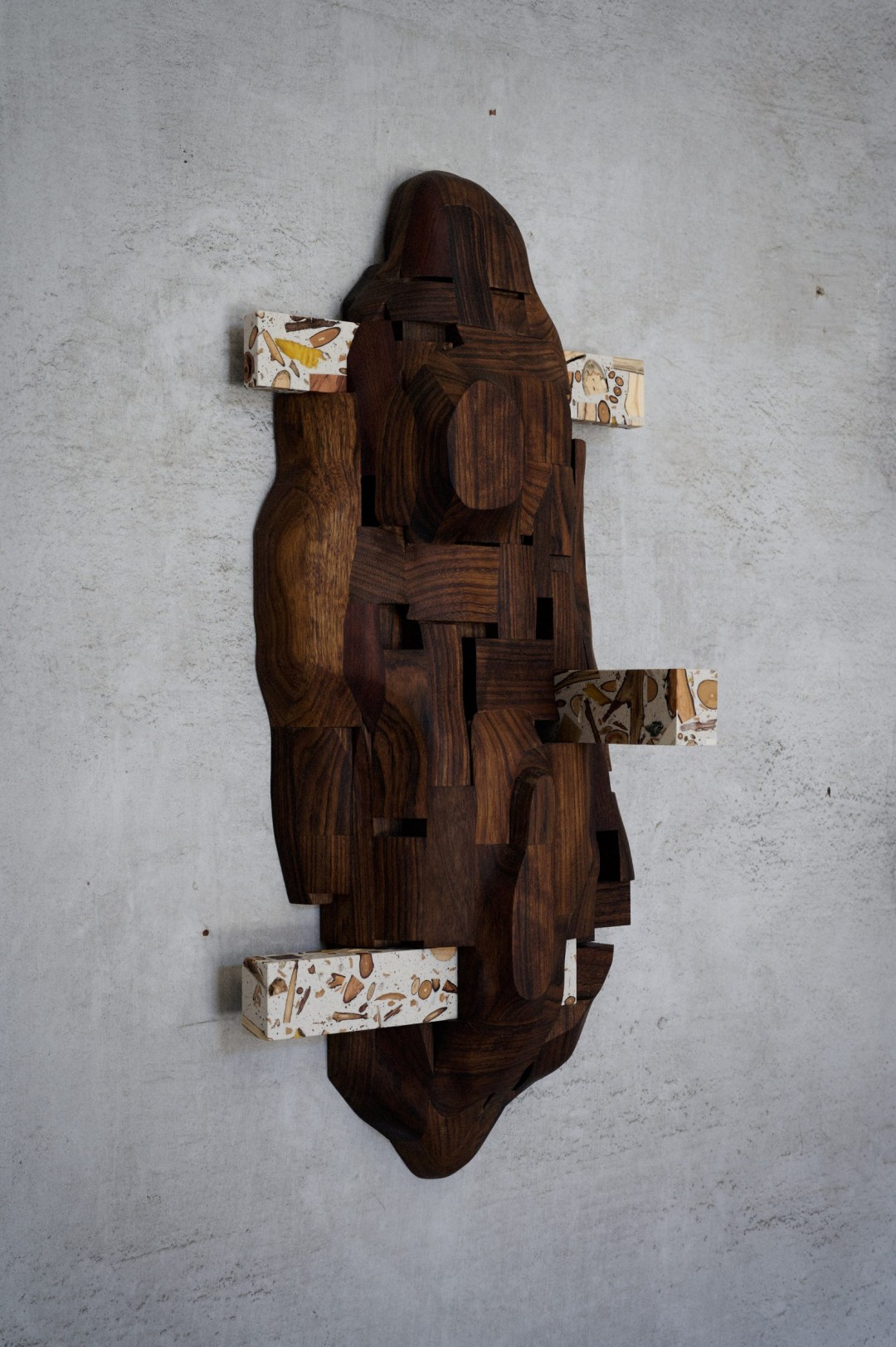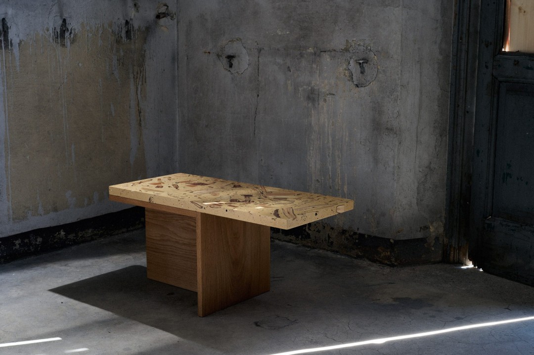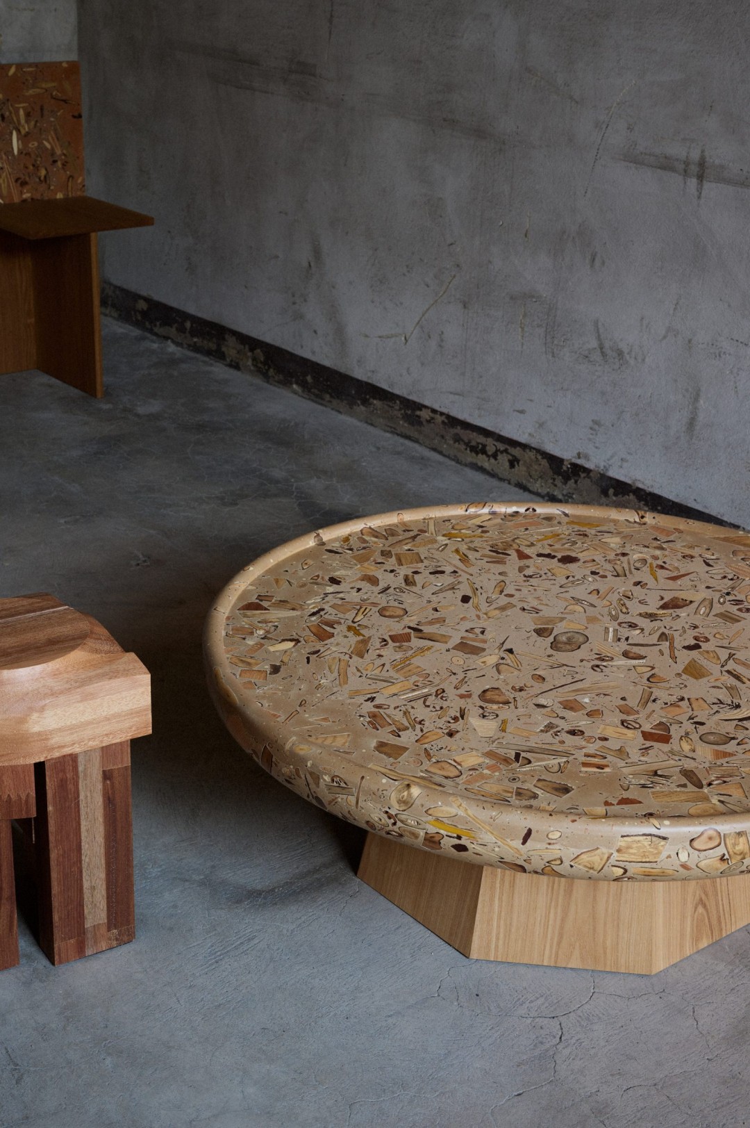Japon tasarımcı Yuma Kano Milano Tasarım Haftası'nda sergilenen ahşap, yaprak, ağaç kabuğu, toprak ve tohumlardan terrazzoya benzeyen dekoratif bir malzeme yarattı. Alcova'daki Touch Wood sergisi kapsamında tasarımcı arkadaşı Sho Ota ile birlikte çalışmalarını sergileyen Kano, projenin ardındaki fikrin sadece kerestede değil, tüm ormanda değer bulmak olduğunu söylüyor. Kullanılamaz ahşap ve diğer orman malzemelerini topladıktan sonra, bunları reaktif mineral bazlar veya uçucu organik çözücüler kullanmayan su bazlı akrilik reçine ile karıştırır. Kano, Dezeen'e "Japon orman endüstrisinde bu küçük ahşap parçaları bir atık malzemedir. Atıkları yeniden kullanmak istedim." dedi.
