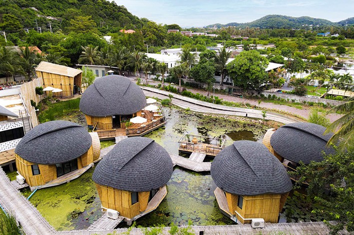 Turtle Bay yüzen yapısı, Tayland'ın Khao Tao Rezervuarı üzerindeki Hua Hin'de, sürdürülebilir tasarımı yerel yapı malzemeleriyle birleştiren ve otelin kendisini çevreleyen ekosistemi koruma taahhüdüne uygun bir eko-turist otelidir.Yaklaşık bir dönümlük araziyi kaplayan Turtle Bay, birbirine ahşap yürüyüş yollarıyla bağlanan beş yüzer bungalovdan oluşuyor.
