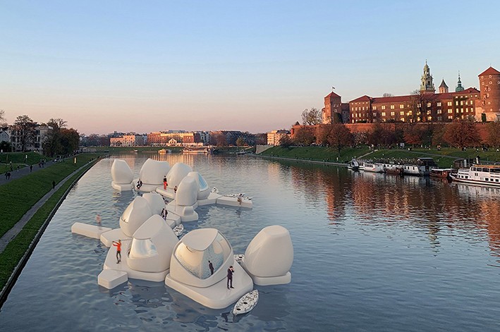 Bu yüzen ofis bölmelerini yapan tasarımcı Agnieszka Białek, tasarımı yaparken Polonya'nın Kraków kentindeki pitoresk temalardan esinleniyor. Bu şekilde tasarımcı, Vistula Nehri boyunca yaptığı olağan pandemi yürüyüşlerinden (tüm hayatımızın en önemli olayıydı) ilham alarak, karada ayak izi olmayan yüzer ortak çalışma alanlarına sahip olmanın ne kadar havalı olacağını düşündü.