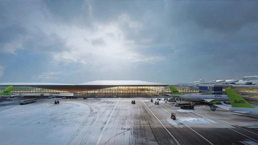 Mimarlık stüdyosu Zaha Hadid Architects (ZHA), Litvanya kültürel mirasından ilham alarak Vilnius Havalimanı için ahşap kaplamalı, plise (kırmalı) bir çatı tasarladı.
